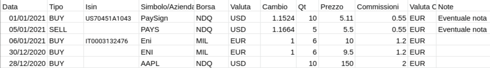 Se ad esempio hai bisogno di aggiungere l’acquisto di azioni dellla Danske Bank hai bisogno di inserire in una riga dell’excel almeno i seguenti valori: