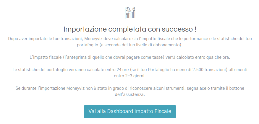 Dopo aver terminato l’importazione Moneyviz avrà bisogno di qualche ora per calcolare il tuo “Impatto Fiscale” ovvero un riassunto sintetico di quanti soldi dovrai versare tramite la tua Dichiarazione dei Redditi