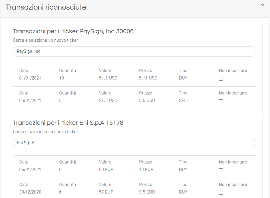 Una volta salvato il tuo file in formato XLSX (ricordati di non modificare le prime due righe !) e aver proceduto con l’importazione Moneyviz ti restituirà una schermata come questa cliccando su TRANSAZIONI RICONOSCIUTE in questo modo potrai velocemente verificare se tutti i dati (soprattutto quelli di quantità, prezzo e valore) siano stati riconosciuti correttamente.