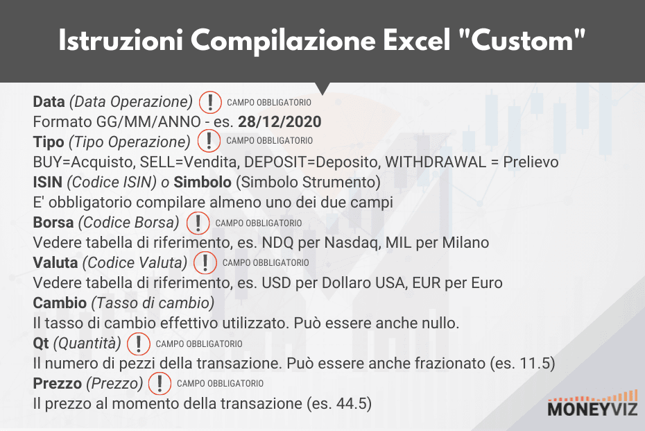 Istruzioni su come compilare correttamente il file excel per inserimento custom = inserimento manuale