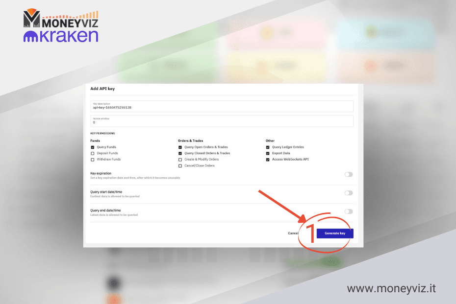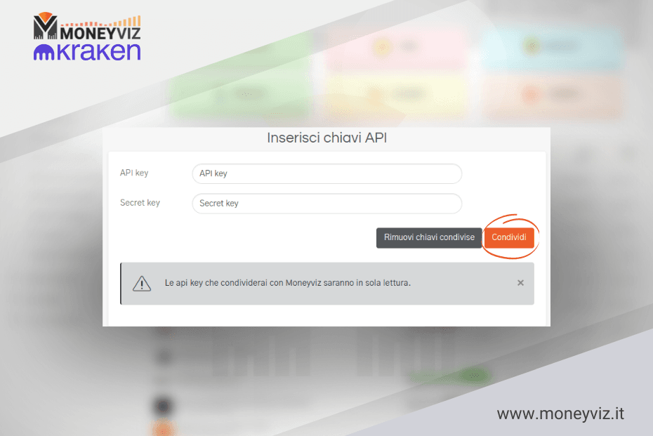 Una volta su Moneyviz bisogna cliccare su Aggiungi Conto, scegliere Kraken e come valuta EURO, cliccare sul bottone CREA PORTAFOGLIO e nella schermata successiva incollare le chiavi ottenute