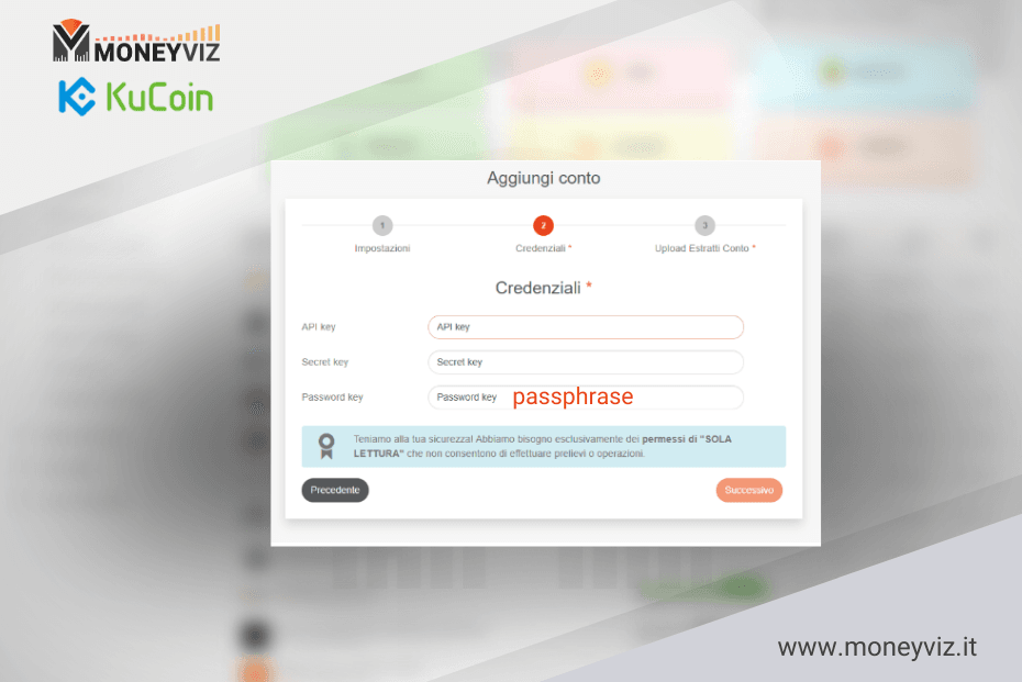 Ora puoi tornare su Moneyviz e cliccando AGGIUNGI CONTO scegliere tra gli intermediari supportati KUCOIN, cliccare sul bottone CREA PORTAFOGLIO e nella schermata successiva incollare le chiavi ottenute. Nella schermata di Moneyviz la Passphrase corrisponde alla Password Key