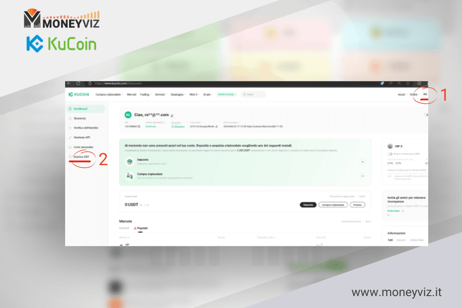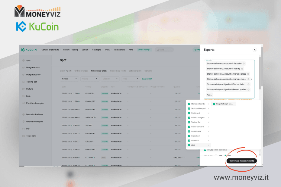 Kucoin non consente l’estrapolazione di tutte le transazioni fiscalmente rilevanti tramite le sue API e per questo motivo Moneyviz ha bisogno di alcuni dati aggiuntivi recuperabili tramite i file CSV messi a disposizione da Kucoin.