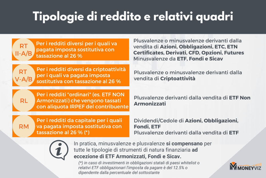 Così come non è possibile compensare redditi diversi di natura differente (Azioni e Crypto) non è possibile compensare redditi da capitali (Dividendi – Quadro RM) con minusvalenze azionarie (Redditi Diversi RT II A/B) oppure plusvalenze da ETF Armonizzati (Redditi di Capitale – Quadro RM) con minusvalenze da Azioni (Redditi diversi – Quadro RT)
