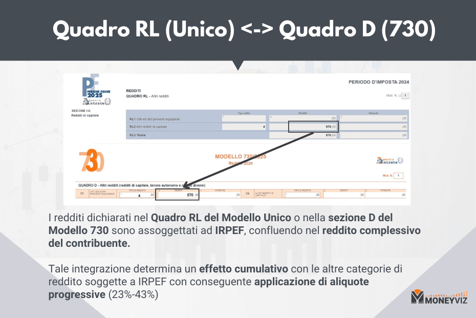 - Quadro D del 730 = Quadro RL Mod. Unico: per la dichiarazione dei redditi di capitale soggetti a IRPEF.