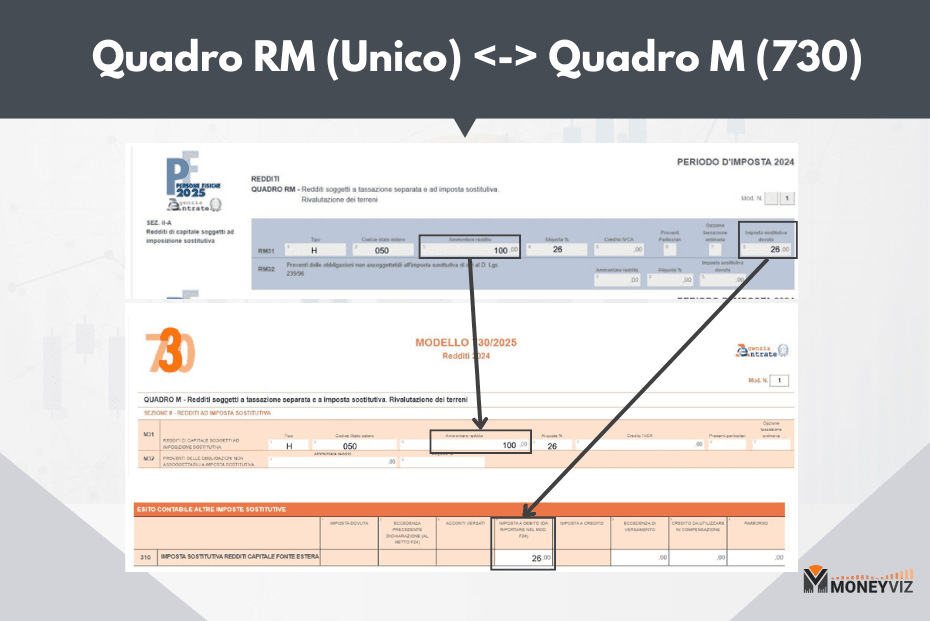 - Quadro M del 730 = Quadro RM Mod. Unico (NOVITA’): riservato alle imposte sostitutive e ai redditi a tassazione separata derivanti ad esempio da dividendi o cedole su investi finanziari esteri.