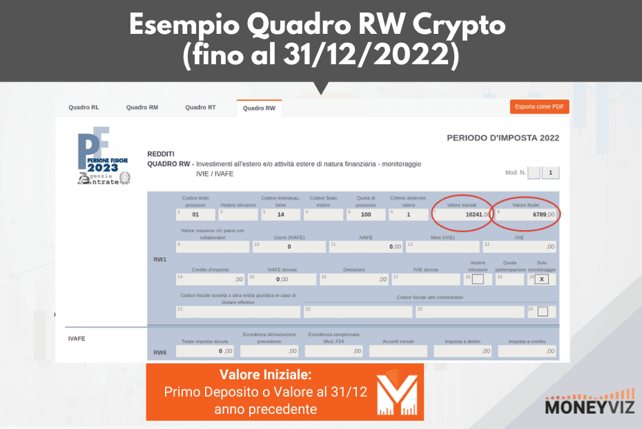 Molti contribuenti hanno inserito nel valore iniziale la somma dei bonifici effettuati per l’acquisto dell’investimento, una pratica derivata dalla semplicità di calcolo in assenza del pagamento dell’IVAFE (Imposta sul Valore delle Attività Finanziarie all’Estero) e dalla volontà di rappresentare con maggiore chiarezza la propria situazione soprattutto in caso di difficoltà di ricostruire il valore dell’investimento per quanto riguarda le criptoattività.