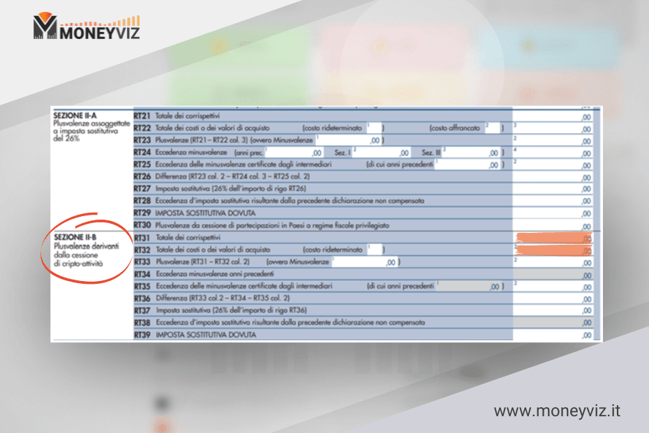 Ciò che ci interessa per le cripto-attività è indicato nei righi da RT31 a RT39.