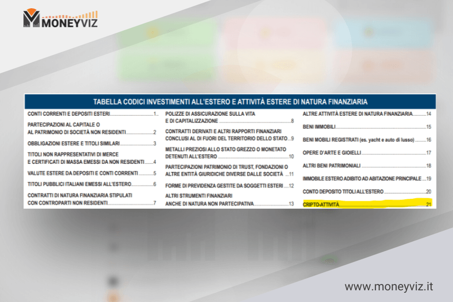 La prima novità è l’introduzione, come conseguenza pratica della nuova normativa, di un codice identificativo specifico per le cripto-attività: il 21 che va riportato nella colonna 4 di ciascun rigo RW compilato.