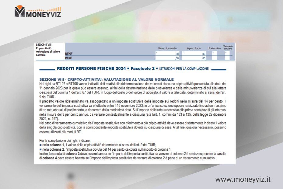 Chi ha scelto di utilizzare l’opportunità offerta dalla legge 197/2022 (ai sensi dell’art. 1, comma 133, della legge n. 197 del 2022) di rivalutare il proprio patrimonio cripto al valore rilevato alla data del 1 gennaio 2023 dovrà compilare la SEZIONE VIII – Cripto-attività: valutazione al valore normale che offre uno spazio in cui dichiarare di aver usufruito di questa opzione e per la quale non era in effetti previsto alcun altro adempimento se non il pagamento nei termini indicati.